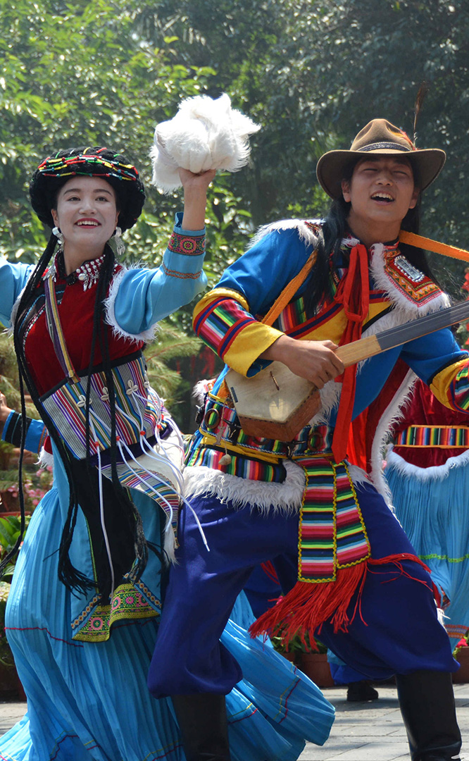 彝族在云南境內約471萬人,是省內人口最多、分布最廣的少數民族,主要聚居在金沙江、元江流域和哀牢山、無量山腹地。彝族是一個能歌善舞的民族,民間打歌、跳樂之風盛行,大三弦、跌腳舞久負盛名?;鸢压澥且妥遄罹咛厣拿褡骞澣?。彝族村占地50余畝,三虎浮雕墻與虎頭內祖師形象表現了彝族虎鷹文化。太陽歷廣場圖騰柱上有太陽、虎、火和八卦圖形象,周圍環繞著10個朝向不同的月球造型,外圓周有12生肖石雕。依山而建的“...